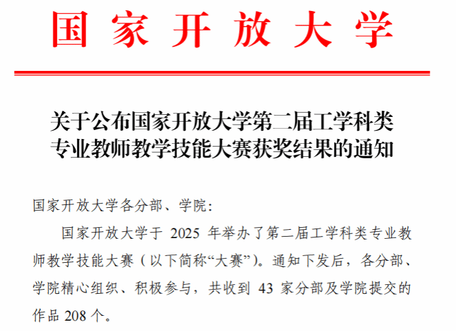 此次获奖是我校深化工科专业教学改革、加强教师队伍建设、推进数字化转型的重要成果,学校将以此荣誉为动力,进一步加强专业内涵和教学团队建设,持续深化教学改革,切实提升教育教学质量,为开放教育事业发展贡献更大力量。