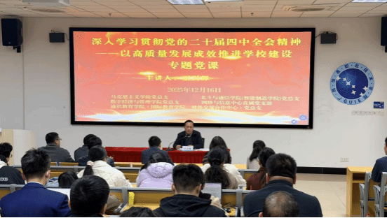 网络与信息中心(图书馆、教育技术中心)韦武超 报道 12月16日,学校校长王兴辉在五象校区鲁班楼以“深入学习贯彻党的二十届四中全会精神——以高质量发展成效推进学校建设”为题,为基层党支部讲授专题党课。马克思主义学院党总支、通识教育学院(国际教育学院、对外交流合作中心)党总支、北斗与通信学院(智能制造学院)党总支、数字经济与管理学院党总支、网络与信息中心直属党支部等支部党员、入党积极分子及有关同志聆听专题党课。