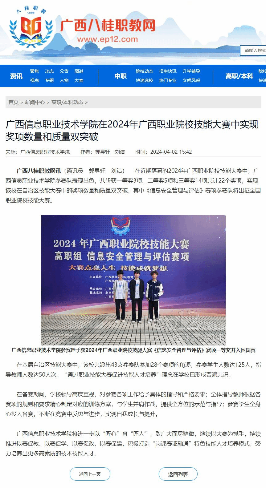 党委宣传部 报道 2024年4月2日,广西八桂职教网以“betvictor网页版首页 在2024年广西职业院校技能大赛中实现奖项数量和质量双突破”为题,报道我校在2024年广西职业院校技能大赛获奖情况。现将报道转载如下。