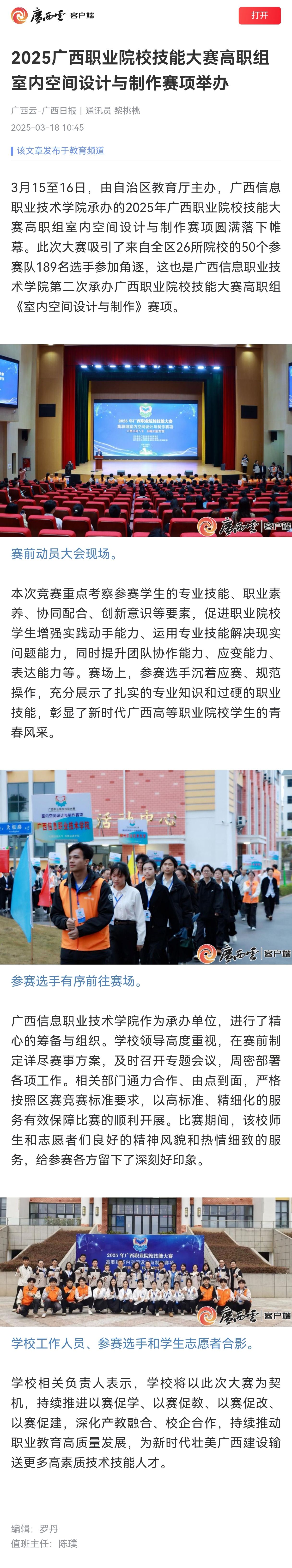 3月18日,广西云-广西日报以“2025广西职业院校技能大赛高职组室内空间设计与制作赛项举办”为题,报道我校承办比赛相关情况。现将报道转载如下。