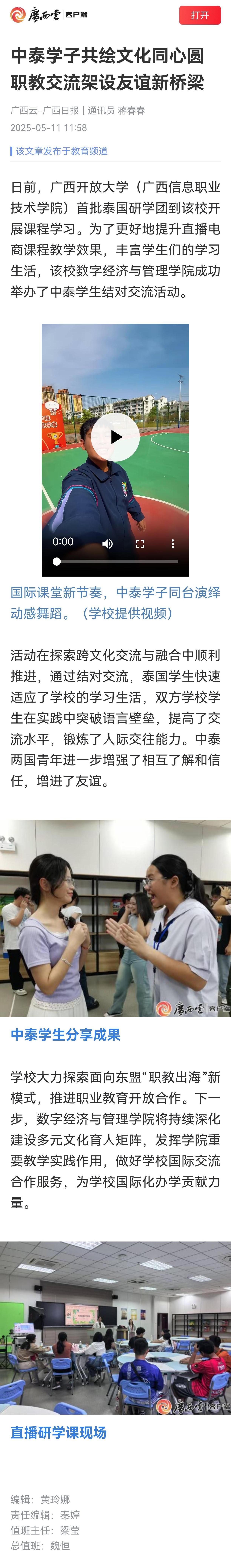 4月25日,广西云-广西日报以“中泰学子共绘文化同心圆 职教交流架设友谊新桥梁”为题,报道了首批泰国研学团到我校开展课程学习的相关情况。现将报道转载如下。
