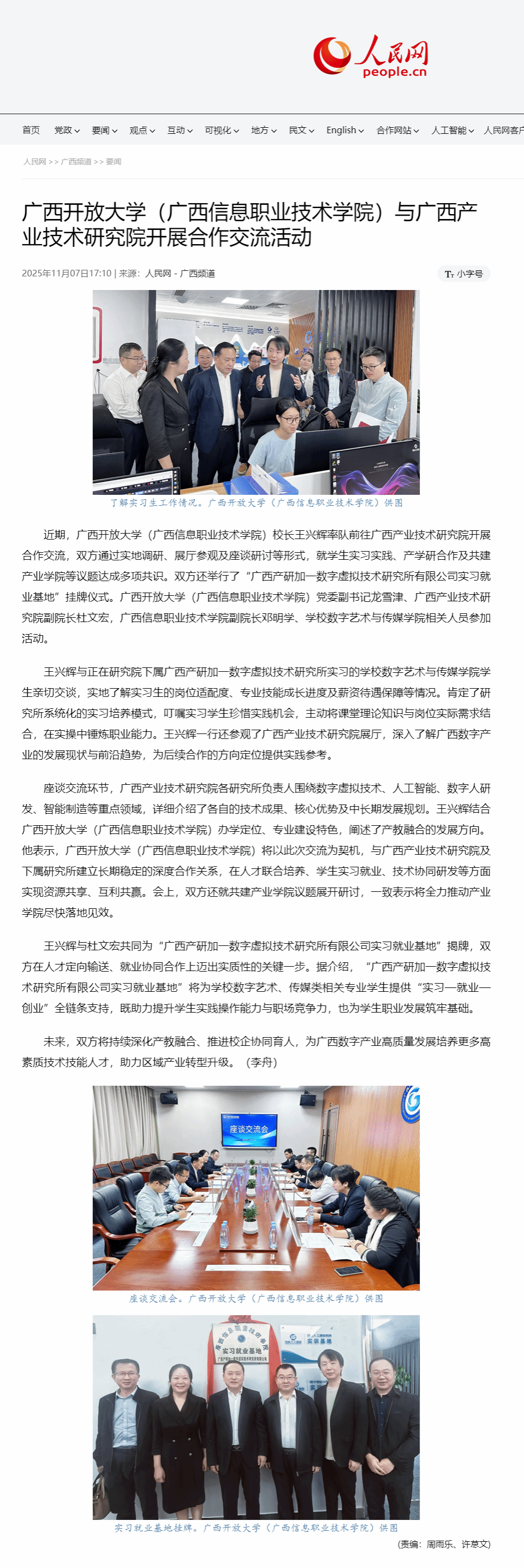 )与广西产业技术研究院开展合作交流活动”为题,报道了学校校长王兴辉率队前往广西产业技术研究院开展合作交流,双方通过实地调研、展厅参观及座谈研讨等形式,就学生实习实践、产学研合作及共建产业学院等议题达成多项共识。双方还举行了“广西产研加一数字虚拟技术研究所有限公司实习就业基地”挂牌仪式等的相关情况。现将报道转载如下。