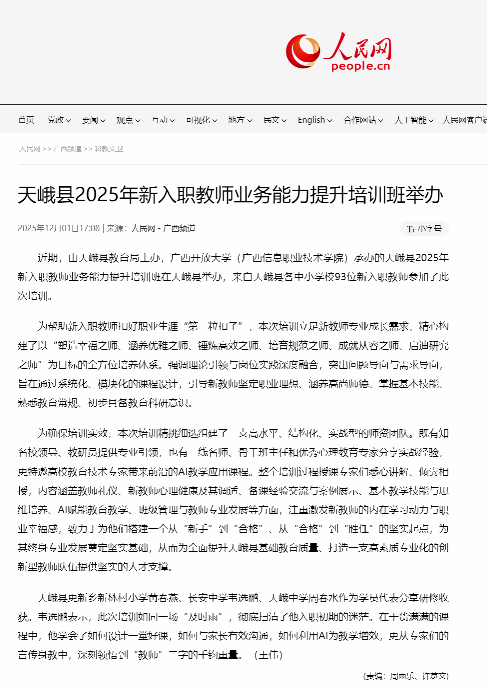 12月1日,人民网-广西频道以“天峨县2025年新入职教师业务能力提升培训班举办”为题,报道了由天峨县教育局主办,广西开放大学(betvictor网页版首页 )承办的天峨县2025年新入职教师业务能力提升培训班在天峨县举办,来自天峨县各中小学校93位新入职教师参加此次培训的相关情况。现将报道转载如下。