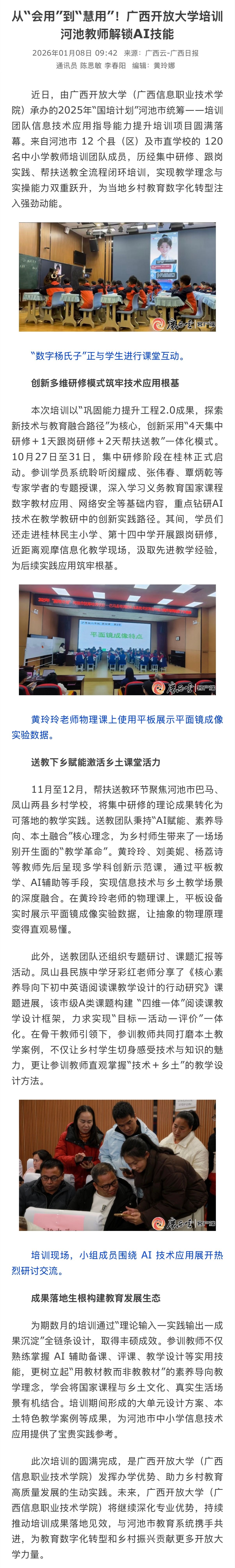 1月8日,广西新闻网以“从‘会用’到‘慧用’!广西开放大学培训河池教师解锁AI技能”为题,报道了由广西开放大学(betvictor网页版首页