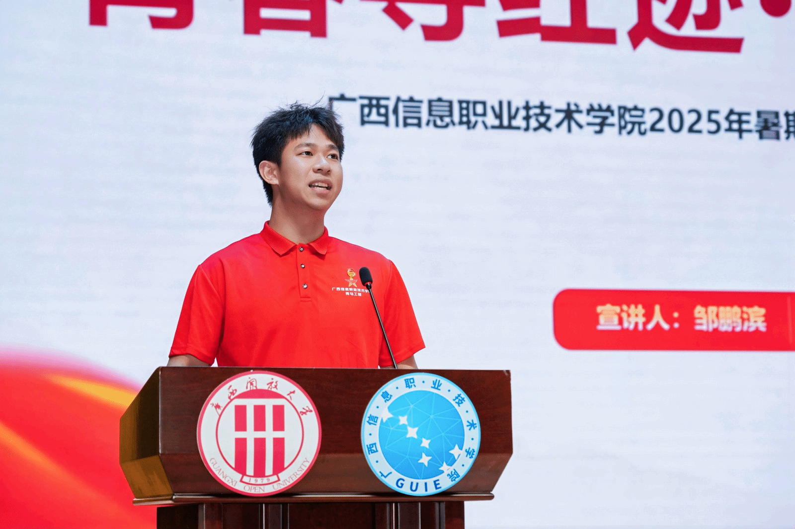 随后,“青春寻红迹 边关践担当”爱国主义教育实践团成员邹鹏滨分享了暑期“三下乡”的感悟。他们重走广西边关红色路线,在龙州起义纪念馆、凭祥友谊关等地探寻红色印记,并跟随边境民警参与巡边。他表示,看着边防官兵日复一日的坚守,才真切体会到“红色江山来之不易”的深刻含义,每一处界碑都见证着边防战士的忠诚与担当。