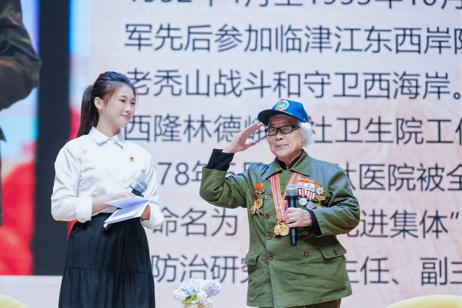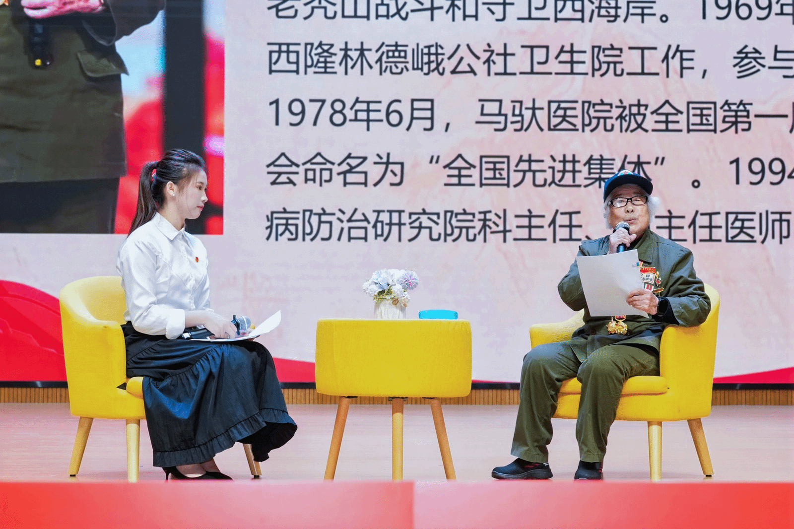 在与老兵访谈环节,主持人黄馨丽与杨兴蓉奶奶亲切对话,带领师生走进这位88岁抗美援朝女兵的峥嵘岁月。杨奶奶14岁参军,1952年随医疗队抗美援朝出国作战。在敌机不断轰炸的夜晚,她借着照明弹的光亮穿梭于伤员之间,战事紧张时一夜接收三百多名伤员。