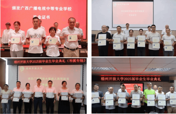 梧州开放大学 黎文华 报道 “作为开放大学的学子,我们中有在职人员、有家庭主妇、有退伍军人,每个人都在工作与家庭的夹缝中挤出时间坚持完成学业,正是这份坚持,让我们收获了丰富的知识和强大的内心。”来自23春开放教育行政管理本科班的胡庆华同学在毕业典礼上拿着毕业证书激动地说道。7月23日至30日,梧州开放大学相继在岑溪市、藤县、校本部(含辅警专场)、蒙山县举行了五场2025届毕业生毕业典礼,梧州开放大学开放教育本科班、单考单招专科班、村“两委”中专班共387名毕业生顺利拿到了毕业证书。