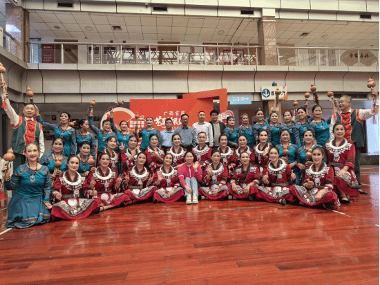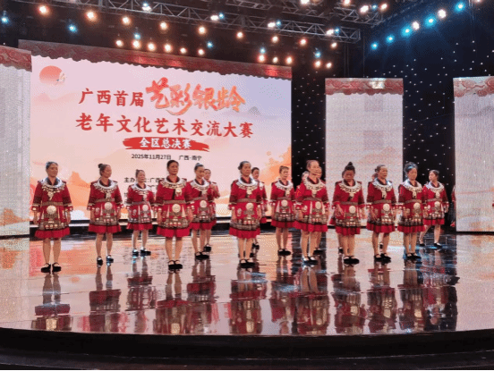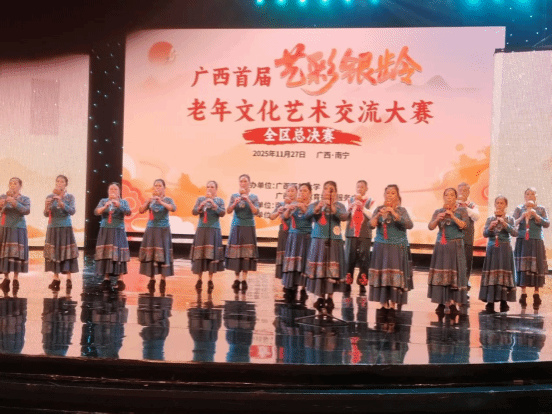 两个节目都经精心打磨,展现银龄风采。民族舞《汝岁岁》节目是一支融合壮族传统舞蹈元素的原创作品,以“岁月流转,亲情永恒”为主题,通过轻盈的舞步、灵动的手势和富有感染力的表情,讲述了壮族老人对过往岁月的怀念与对美好生活的向往。葫芦丝《姑娘生来爱唱歌》节目是云南民歌,讲述的是姑娘们在丝竹声中的青春回响和姑娘们热爱生活、放声歌唱的场景生动再现。演出中学员们身着蓝黑相间的民族传统服饰,手持壮锦图案的银圈道具,时而围成圆圈翩翩起舞,时而排成队列变换队形,将壮乡人民的热情与淳朴表现得淋漓尽致。