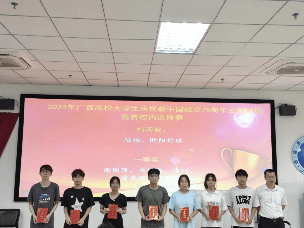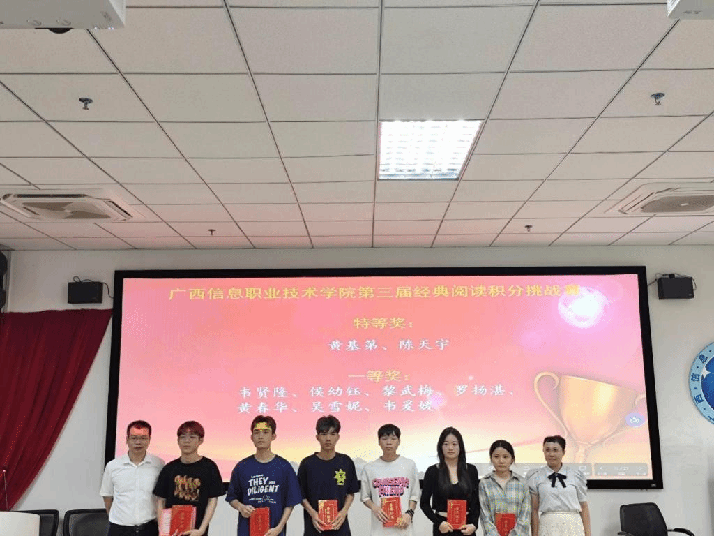 第三届经典阅读积分挑战赛中,我校两名同学在全区高职高专院校组个人赛决赛中获得二等奖、三等奖各一项,我校评出特等奖2名,一等奖6名,二等奖10名,三等奖39名。在2024年广西高校大学生庆祝新中国成立75周年主题知识竞赛中,我校两名同学在全区高职高专院校组个人赛中获得优胜奖,校内选拔赛评出特等奖2名,一等奖5名,二等奖8名,三等奖19名,优胜奖37名。在第六届广西高校大学生“学问杯”影评大赛中,我校1名同学进入全区决赛并获得优秀奖,校内选拔赛评出特等奖1名,一等奖2名,二等奖5名,三等奖9名,优秀奖8名。